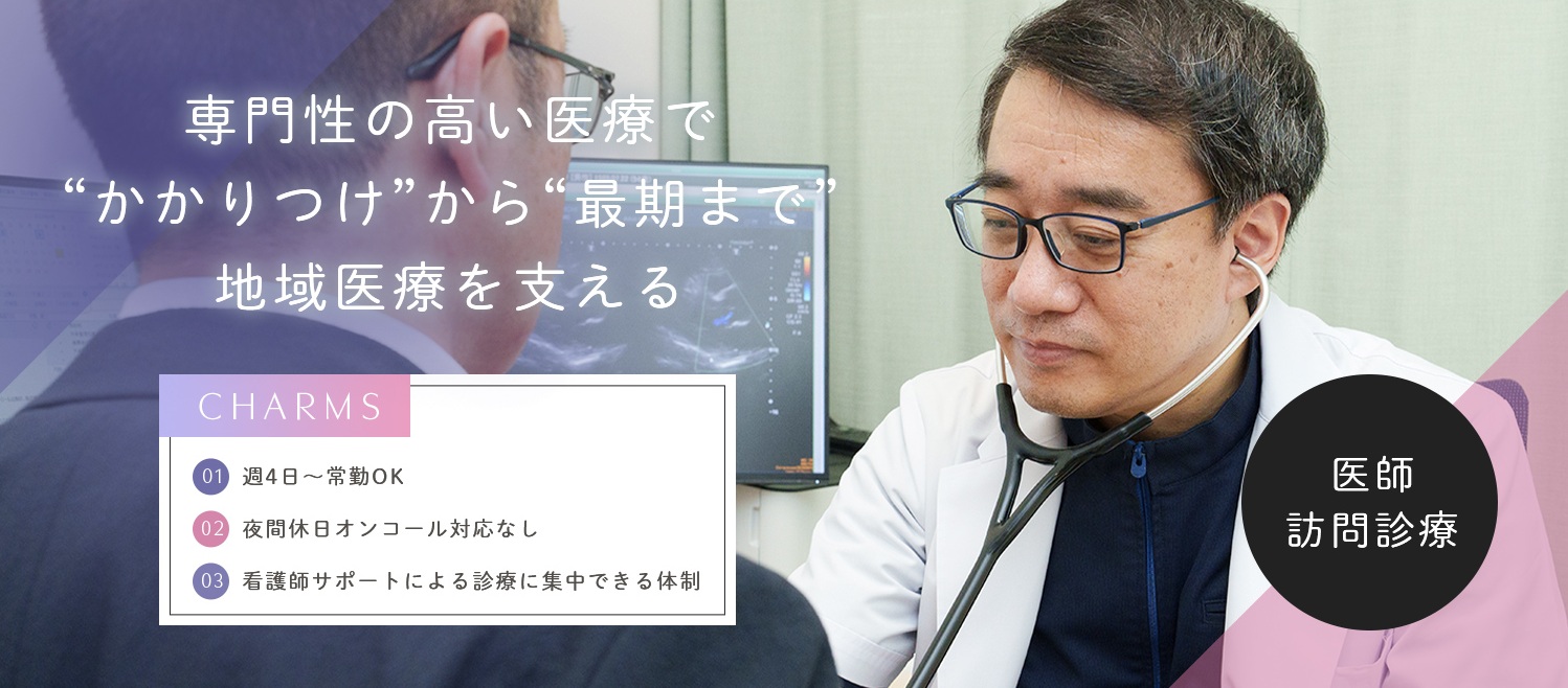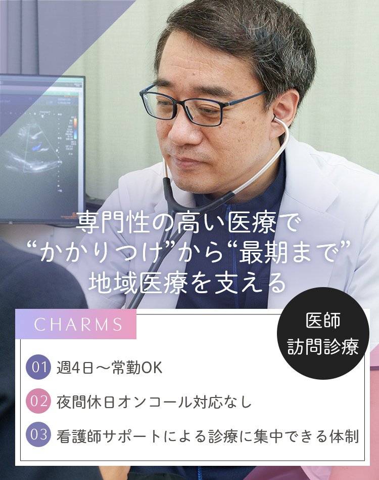 - 訪問診療で慢性期・難病・がん末期など幅広い疾患、様々な医療処置、緩和ケアに取り組みたい